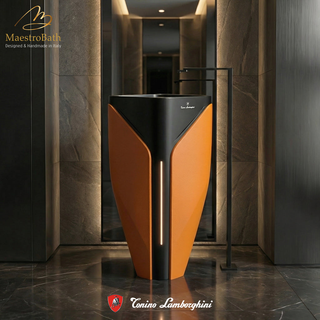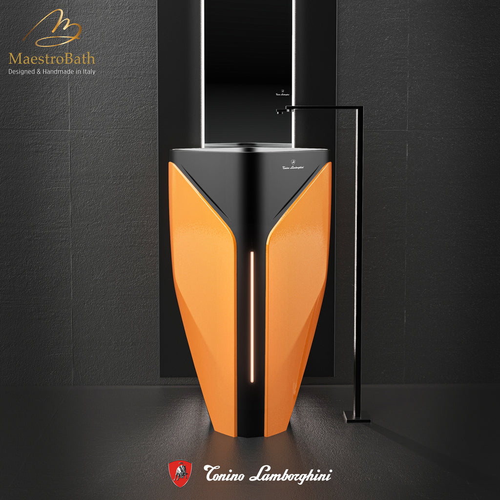 Introducing the Iconico freestanding sink, a true embodiment of luxury and design innovation. This sink boasts a captivating blend of hues, creating a striking aesthetic that demands attention. The sleek lines and minimalist silhouette contribute to a modern and sophisticated appeal, making it a focal point in any bathroom. Crafted with precision and adorned with the iconic Tonino Lamborghini emblem, this freestanding sink is more than a functional fixture—it's a statement piece that redefines contemporary bathroom aesthetics. Experience the pinnacle of luxury with the Iconico sink. Available in Blue and Black, Orange and Black, Green and Black, and Black and White finishes.