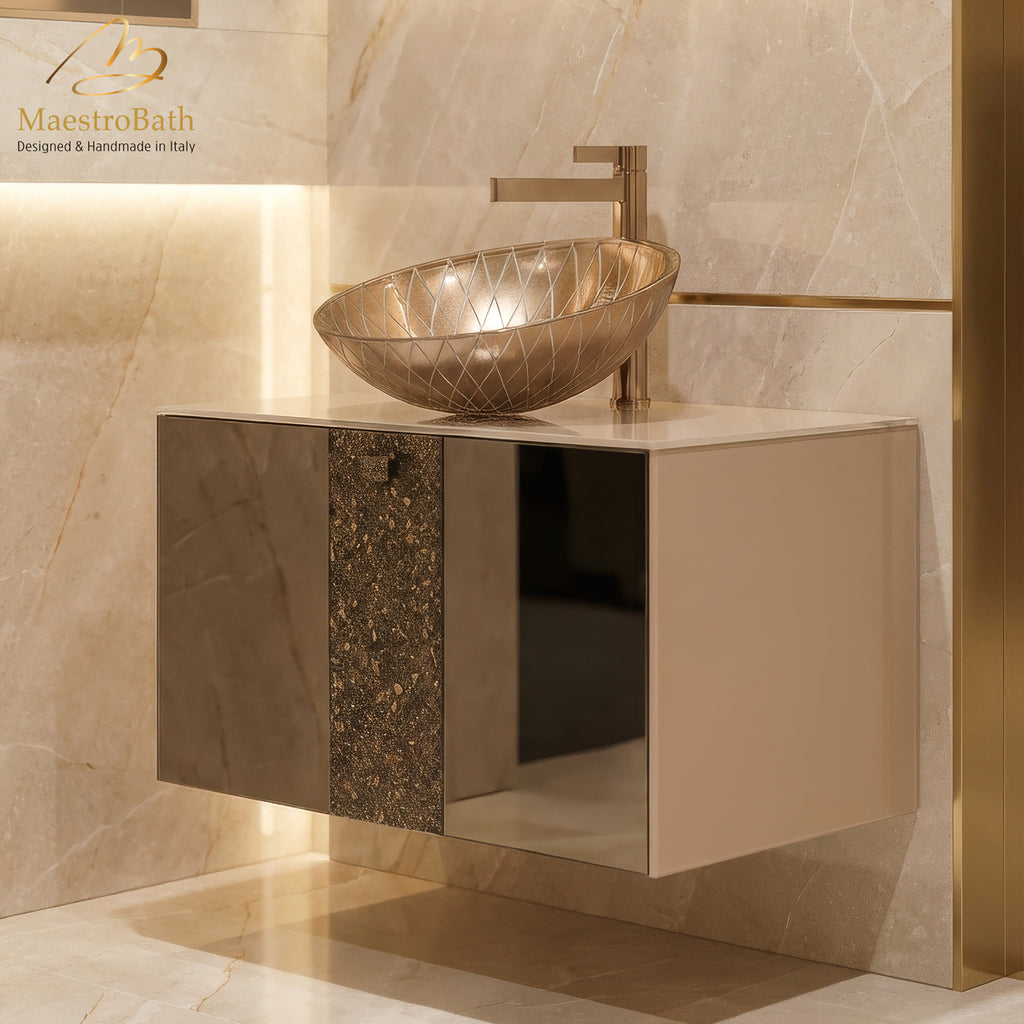 Available in Bronze Mirror, Black, and White finishes, the Bronze option adds a touch of serenity, reflecting the calmness and purity of its surroundings. The matching bronze mirror enhances the ambiance, subtly mirroring the colors and hues of the environment, creating a harmonious and dynamic visual experience. Customize your setup further with a choice of a Tempered Pre-Fabricated Reflective Glass countertop or Tempered Reflective Glass Integrated Sink.