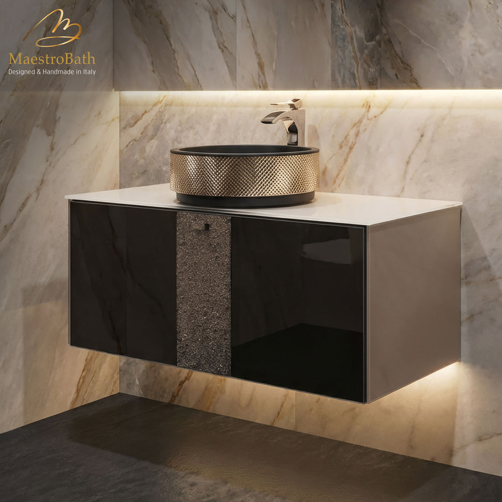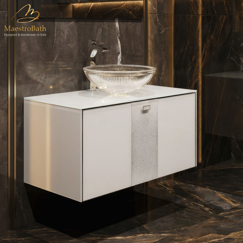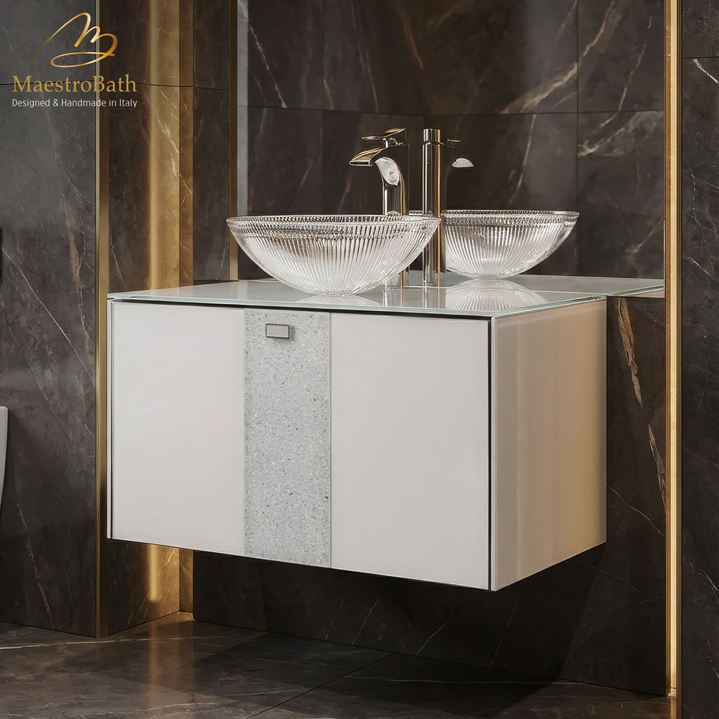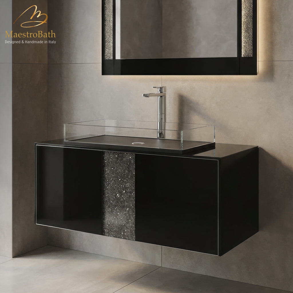 The Lucent luxury bathroom vanity embodies Italian artisanship and regal elegance, seamlessly blending luxury, extravagance, and tranquility. Adorned with a central stripe of crystals reminiscent of snowflakes, it exudes opulence in your bathroom decor. Meticulously crafted from premium wood and MDF materials, this vanity guarantees exceptional durability and quality. Its soft-closing drawer offers convenience and protection against accidental damage, while the pre-drilled sink and faucet hole ensure effortless installation.